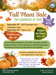 - All plants are reduced by 25% and the ever popular bargain bin will have plants at a 50% discount(what I refer to as ‘pot bound specials’, plants that just need to get out of the pot to thrive) Victoria Master Gardeners, HCP staff, volunteers and PHC students are on site as well to answer your gardening questions and help you choose the right plant for your garden.